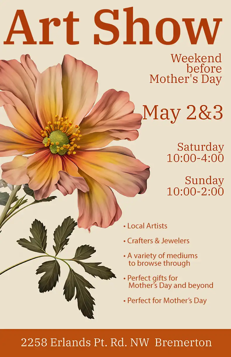 On May 2nd and 3rd, the League of Kitsap Artists and Crafters is gathering in my backyard for a relaxed, community‑focused art show featuring about 10 local artists and makers. This is one of my favorite events of the year, a chance to slow down, wander through handmade work, and meet the people who create it.